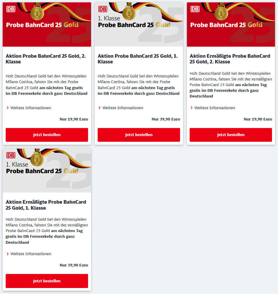 【DB Bahncard 又放大招!Probe Bahncard 25 Gold三个月卡特价仅19.90欧!冬奥会德国夺金就能免费坐ICE!!!】德铁DB推出Probe Bahncard 25 Gold三个月特价仅19.99欧,而且2月6日至2月22日冬奥会期间,只要德国队获得金牌,第二天就能拿着这个卡免费在德国境内坐ICE!这就是说走直接走的免费旅行!比如德国队在2月6号拿到金牌,那么2月7日就能免费坐车。买了这个卡的小伙伴冬奥会期间记得关注德国队有没有拿金牌哦~活动有效期至2月5日!
